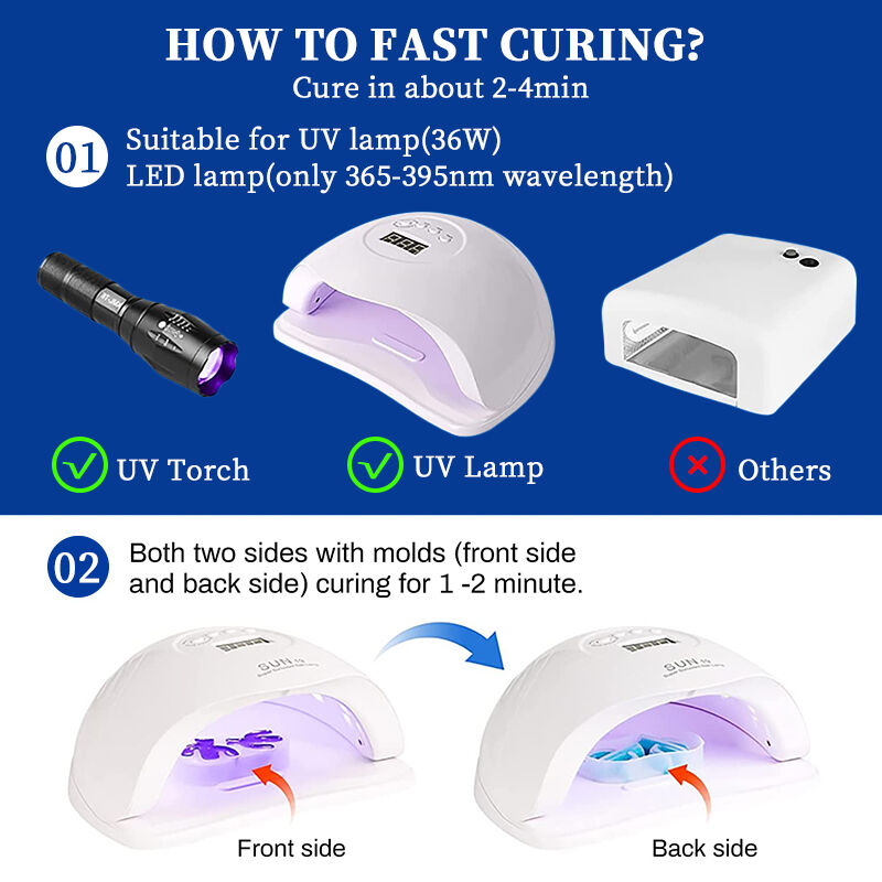 6.UV Cure: Place the mold under the UV lamp and expose each side for 2–3 minutes until fully cured.